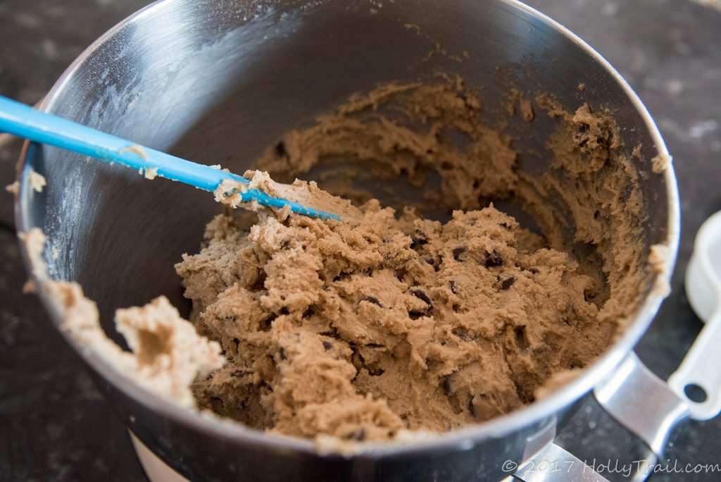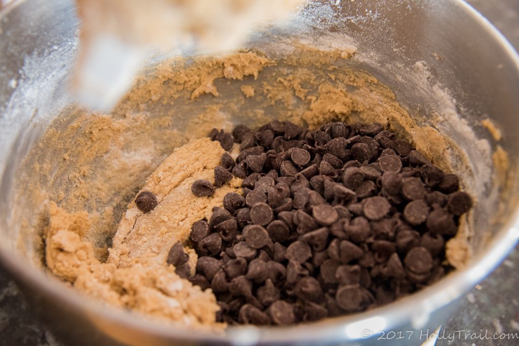 - In a separate bowl, combine flour, baking soda, salt, and spices. With the electric mixer on low speed, gradually mix the flour mixture into the egg/butter mixture. Before the flour mixture is well-combined into the egg/butter mixture, add in chocolate chips all at once. Continue mixing on low speed just until flour mixture and chocolate chips are fully incorporated.