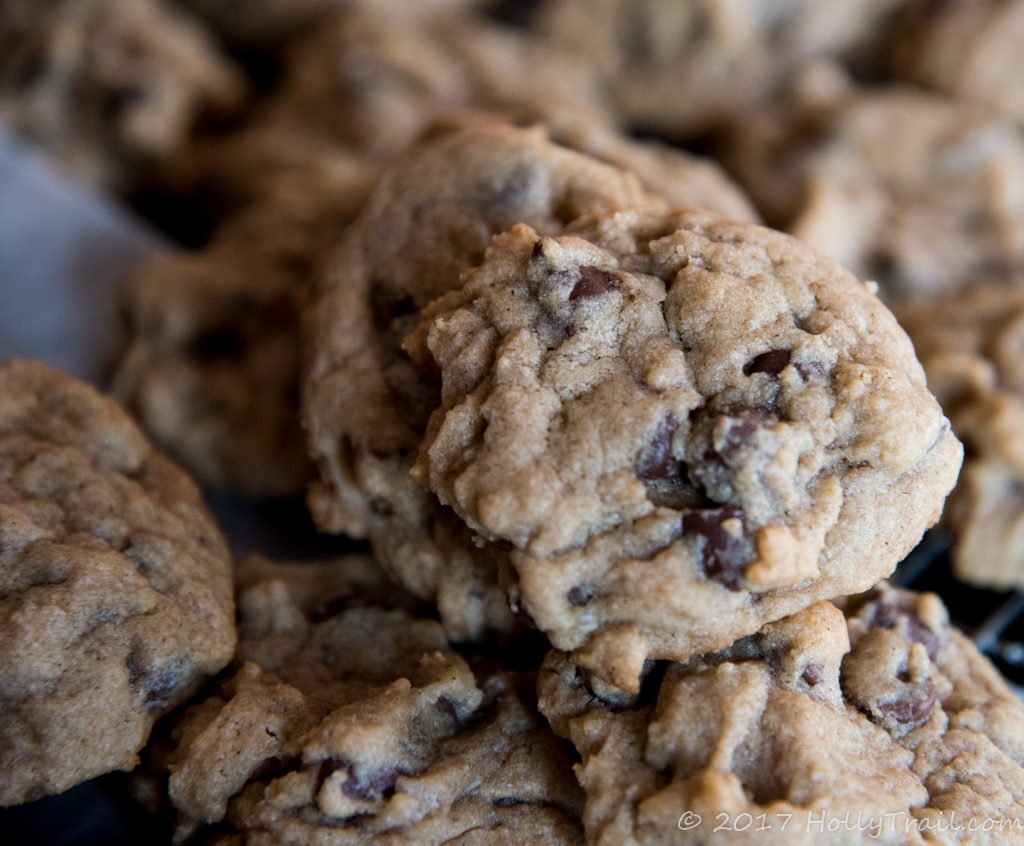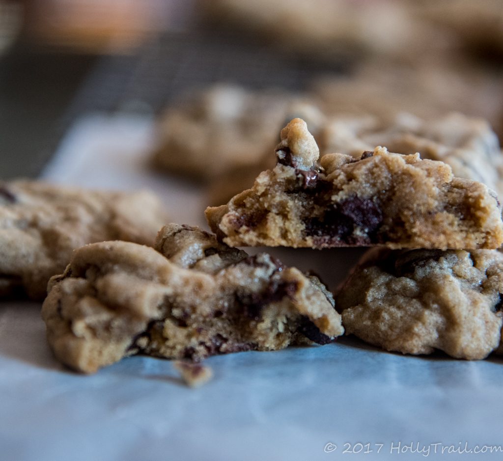 Taken from a textbook on bread and pastry making, I tried out using bread flour rather than all-purpose flour, but feel free to use either. I gradually added in the flour/spice mixture but did not complete mixing it in before adding the chocolate chips. That’s another piece of advice from the bread and pastry textbook. Adding in the chips before the flour has been fully incorporated prevents over-mixing the dough. Too much mixing and the cookies will spread too much.