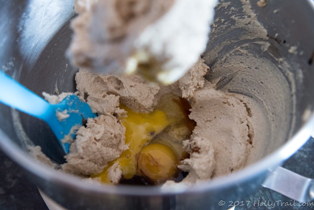 Next, I added in the eggs, dissolved coffee, and vanilla extract. I should have incorporated the eggs one at a time until emulsified and then added in the coffee and extract, but I was rushing. The dough didn’t curdle, so it worked out OK.