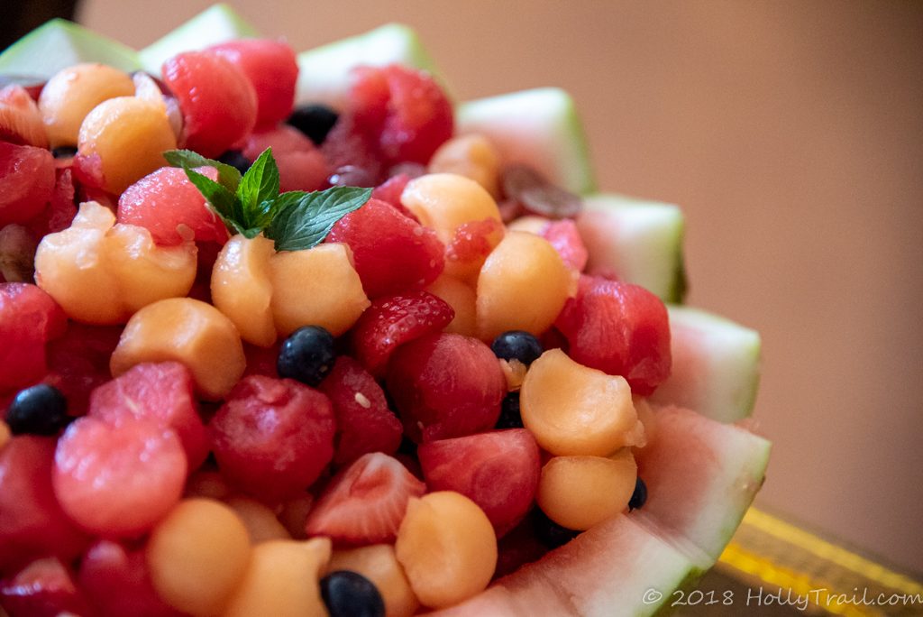 While I was preparing the berries, my son prepared the watermelon half that was now empty to serve as the fruit bowl. He scraped the rind so that some pink flesh still remained and the surface was smooth. He then cut out triangles around the perimeter. It turned out to be an extra step that was well-worth it! If you intend to use the watermelon as a serving bowl, cut the top 1/4 off the watermelon rather then cutting the watermelon in half. This will give you more room to fit the fruit.