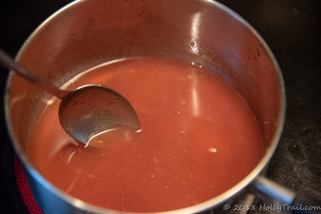 To make the fruit salad, the first thing I did was make the dressing, because the dressing has to cool off for an hour or so. I brought to a boil a mixture of water and white sugar to make a simple syrup. I then took it off the heat, poured the simple syrup into a Pyrex measuring cup, and added in juice freshly squeezed from two limes, one lemon, and one orange. I added the zest from the lemon and the orange. [To make it sweeter, which may be required if your watermelon is extra juicy, some brown sugar can be cooked with the white sugar when making the simple syrup. I actually should have done it this way this time around. I found a way to correct the mistake, which I’ll talk about later.]