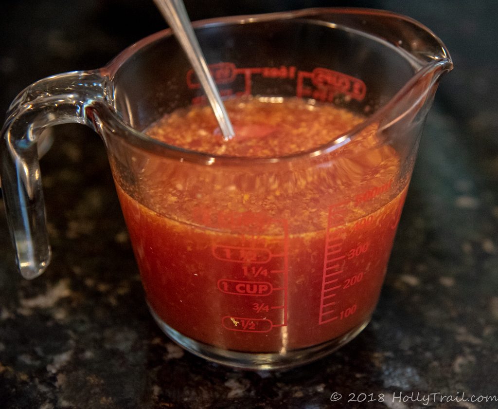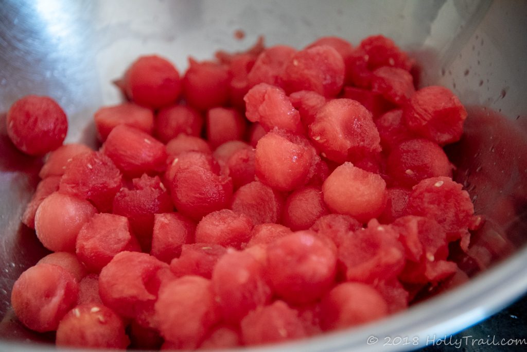 I have to admit that I met up with a problem after waiting the 2 hours. I took a taste test and found that the taste of the dressing was overpowered by all the juice from the watermelon. After panicking a little bit, I drained off the juices into a saucepan, added the brown sugar (even at this late stage) and brought the juices to a boil. From the color, it looks like the watermelon juice took over!