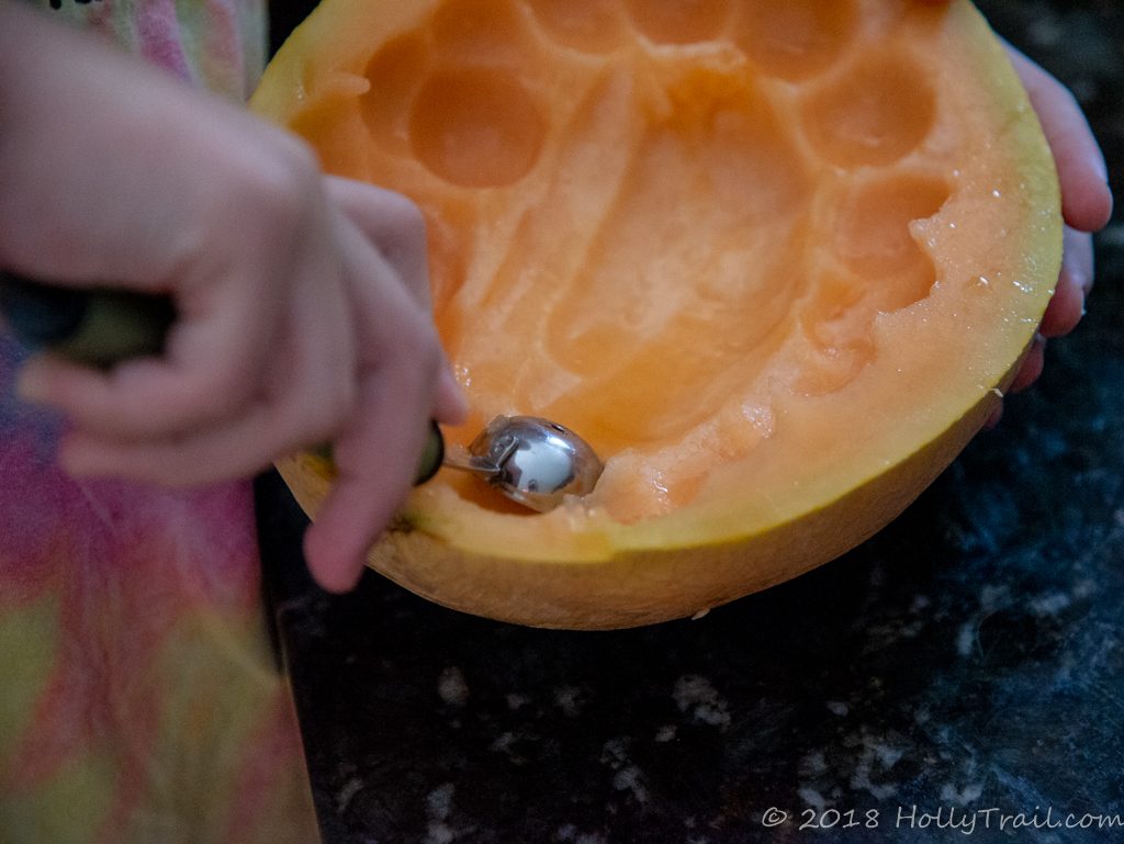 I then got my kids to scoop out balls of cantaloupe. Honeydew would have been a good choice too, both for taste and color, but I didn’t have any on hand this time around.