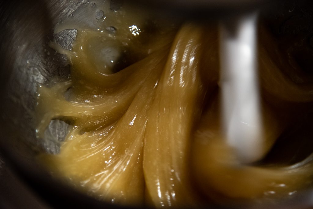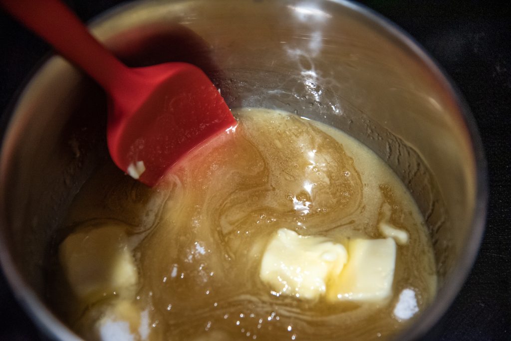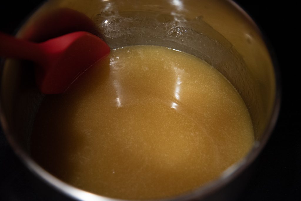 - In a medium pot, heat honey, sugar, and butter pieces on medium low, stirring occasionally, until butter melts. Remove from heat and set aside to cool for at least 20 minutes or until lukewarm to the touch.