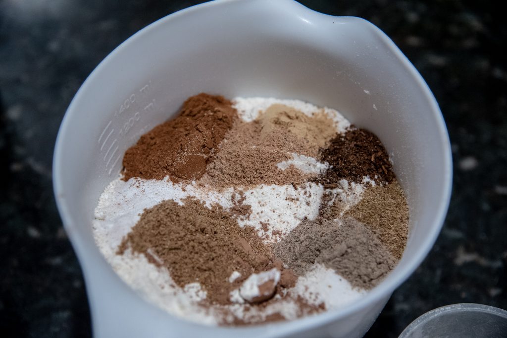 Preheat the oven to 350°F/180°C. Whisk together flour, baking soda, salt, cocoa powder, and spices. While sifting isn’t required, it is definitely a step worth taking, especially for the cocoa powder (to get rid of the lumps). The spices I like to use are: cinnamon, ginger, cloves, nutmeg, pepper, cardamom, coriander, and anise. Use only a dash of pepper. You should have about 3 tablespoons of spices. If you don’t have cardamom, coriander, or anise, that’s not really a problem–just add allspice and more ginger and cinnamon. Personally, I find that cloves provide the most distinctive flavor out of the bunch.