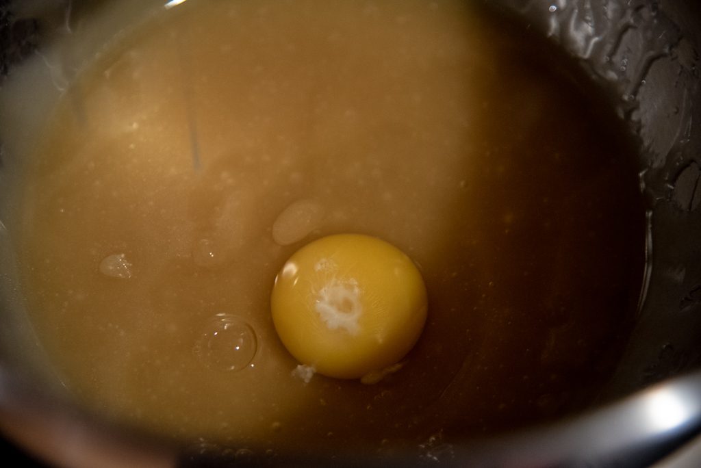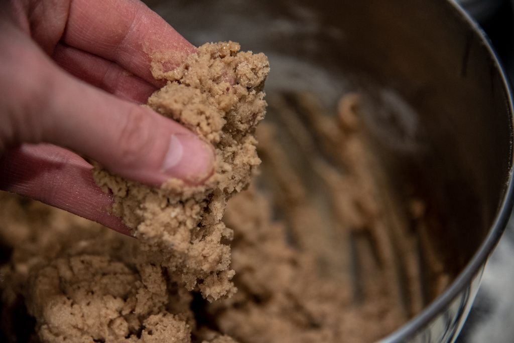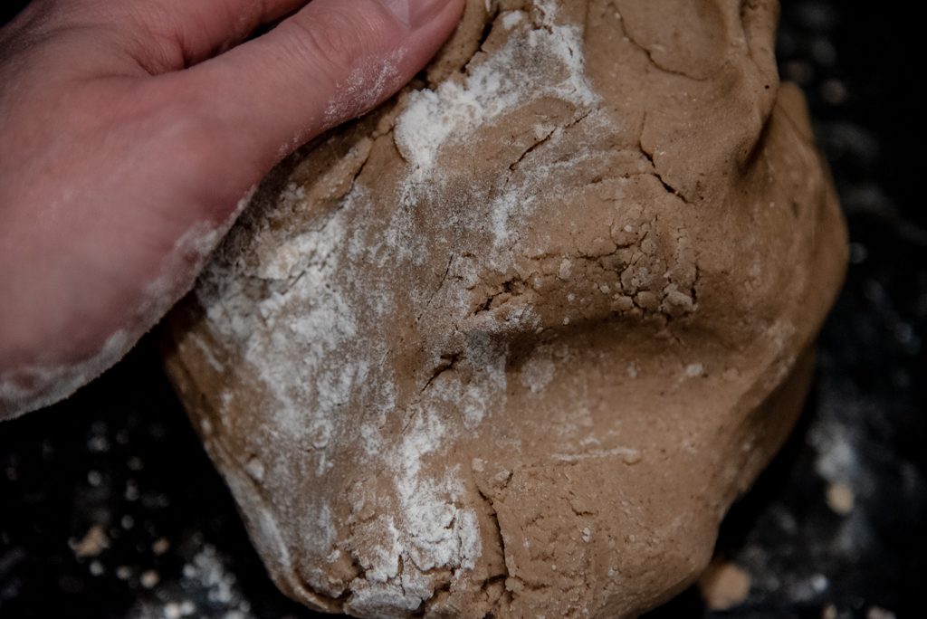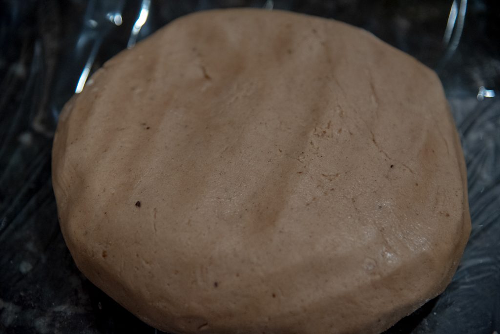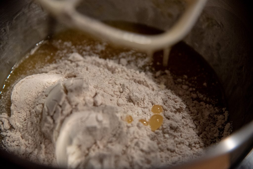 - Pour cooled honey mixture into the bowl of an electric mixer. On medium low speed, mix in egg using the paddle attachment. Gradually add in flour mixture. Increase speed for a few seconds, but just before the flour mixture is fully incorporated, stop mixer. Turn out dough onto lightly floured work surface (countertop or board). Knead until dough is smooth and form a disk. (Avoid adding additional flour unless dough is too sticky to handle.) Divide dough into 4 pieces. Take one piece for rolling and wrap the remaining dough in plastic wrap.