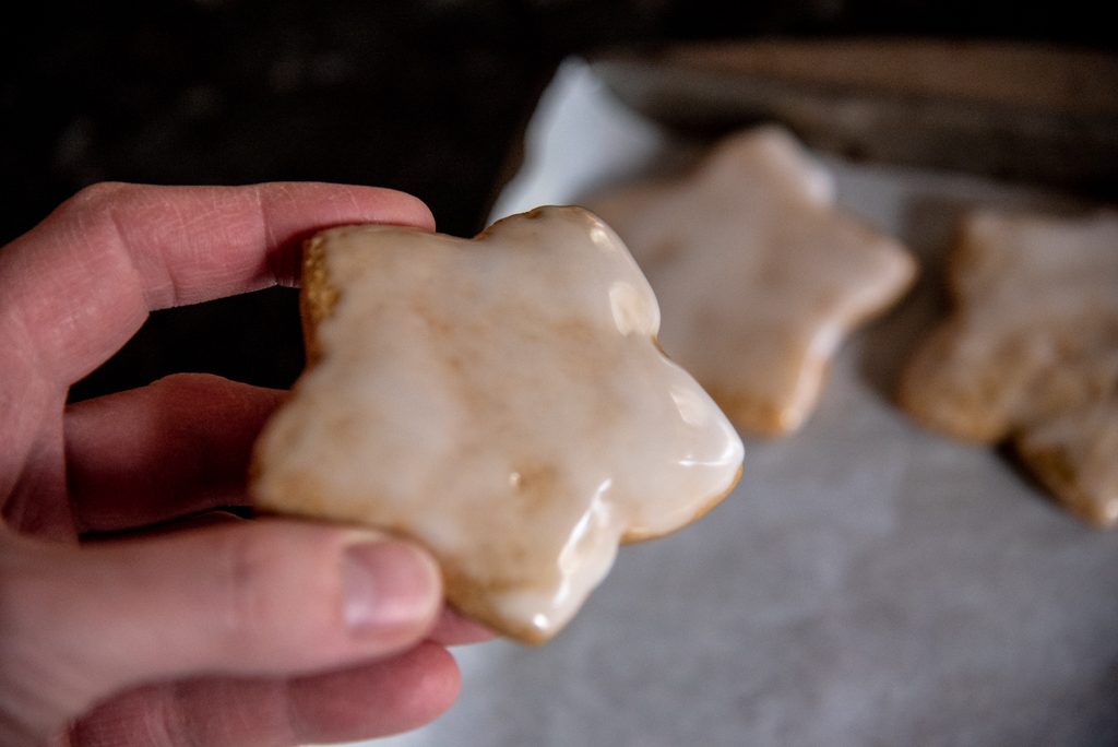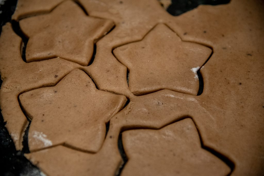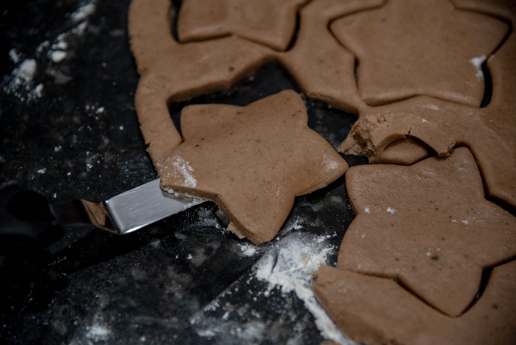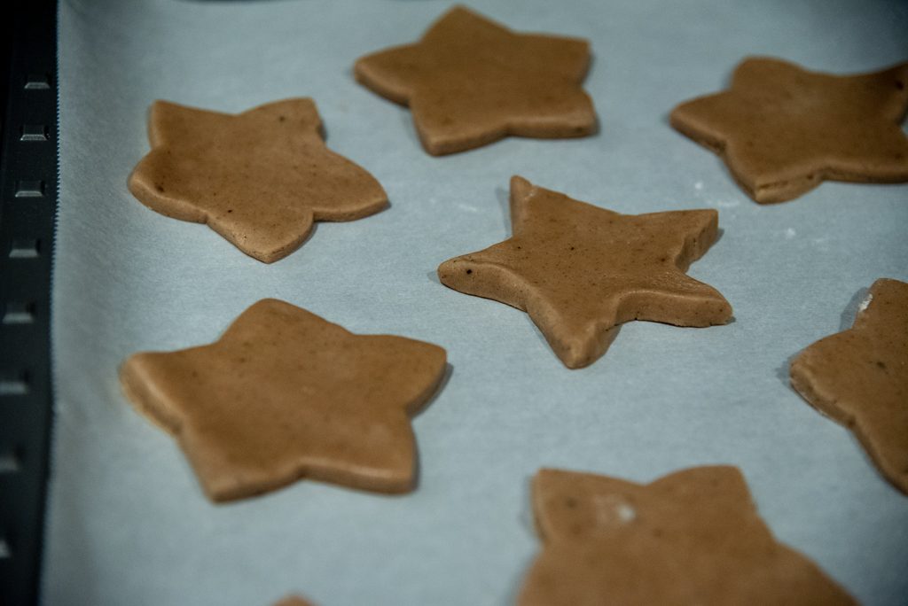 The star is a traditional shape, but any Christmas cookie cutter shape will do. Stick to cutters that are between 2 inches and 2.5 inches. By the way, you may find that the dough may begin to stick to your work surface if it sits there too long. If this happens, use a spatula to carefully lift the cookies off the counter. If that doesn’t work, you may have to simply gather up your dough, re-flour the work surface, and start the rolling process over again.