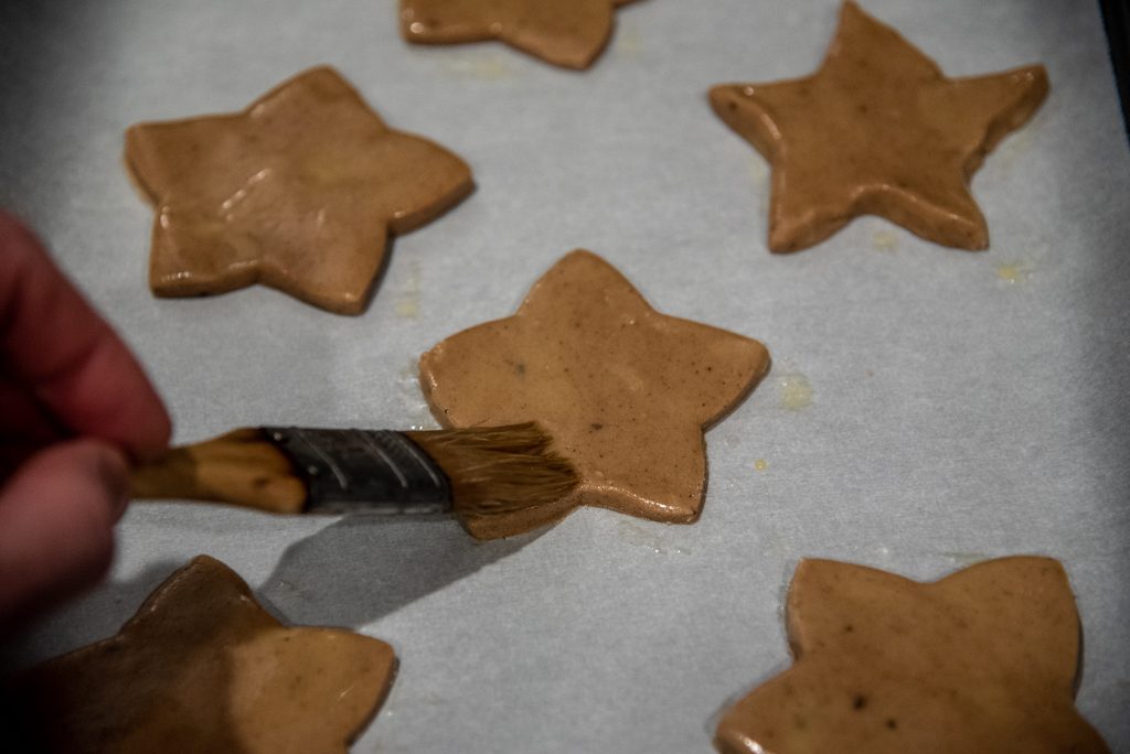 If you want some shine on your cookies, brush them with lightly beaten egg. This step isn’t really necessary if you plan on glazing the cookies after they’ve baked.